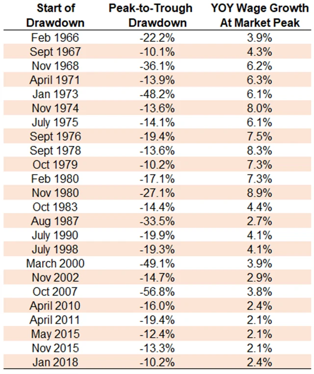 Načasování investice do akcií na základě růstu mezd ovšem (stejně jako v případě jakéhokoli podobného indikátoru) nemusí fungovat. Tabulka shrnující korekce indexu S&P 500 od roku 1965 společně s mírou růstu mezd před začátkem propadu to ukazuje jasně.