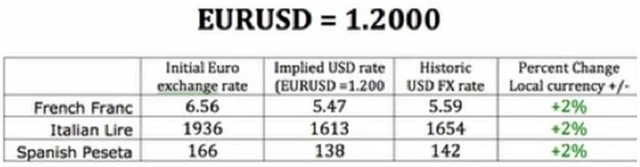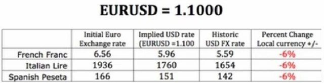 V následující tabulce jsou zobrazeny konverzní kurzy bývalých měn k euru, jejich současný a tehdejší přepočet na dolary a procentní změna měnových párů ("+" znamená oslabení dolaru a posílení lokální měny).