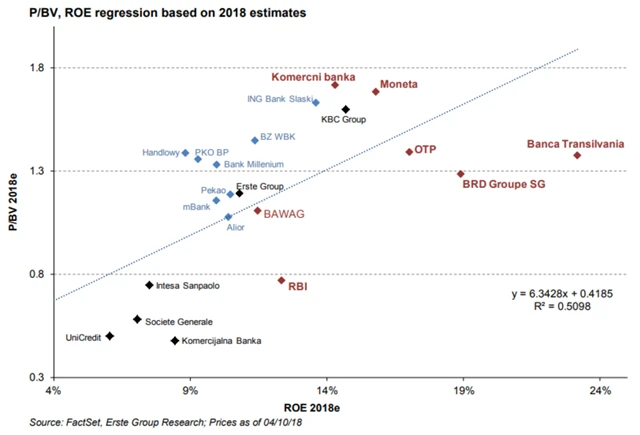 Vůči evropským bankám se ty české obchodují na prémiových valuacích. Jde nicméně o odraz nadstandardní návratnosti vlastního kapitálu ve srovnání se středoevropskou konkurencí, a zejména pak se západoevropskými finančními skupinami.