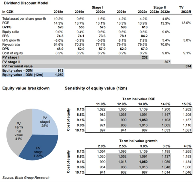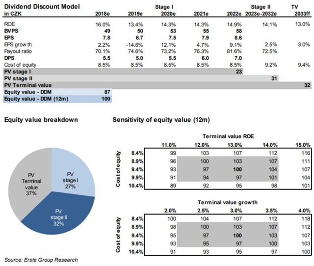 Dividenda zůstává důležitým aspektem investičního příběhu. "Pro letošní rok počítáme s dividendou 48 Kč na akcii, což odpovídá výplatnímu poměru 65 %. V letech 2019-2022 počítáme s posunem do pásma 70-80 %. Výnos nad úrovní 5 % vnímáme jako atraktivní. Ocenění optikou tržní kapitalizace vůči hodnotě vlastního kapitálu (P/B) by pro rok 2018 mělo dosahovat 1,7násobku, což nepovažujeme za přehnané," uzavírá Unger.