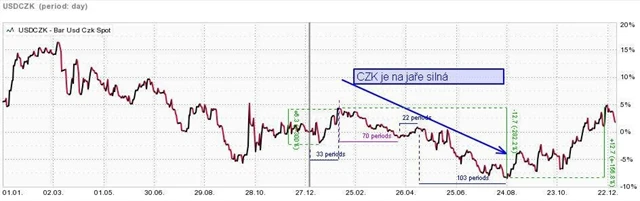 A nyní k výsledkům. USDCZK - typicky je česká koruna na jaře proti dolaru silná. Roste od počátku února do konce dubna, pak nastává několikatýdenní přestávka (zhruba do konce května) a následuje další růst koruny až prakticky do konce prázdnin.