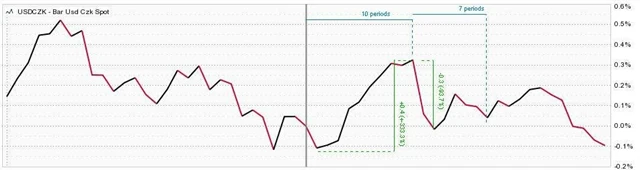 USDCZK, typický měsíc, medián. Pokud už musíme měnit koruny na dolary nyní, je to nejlepší provést vždy hned na začátku nebo uprostřed měsíce. Nejhorší to bývá desátý den v měsíci, kdy je dolar v průměru ke koruně nejsilnější.
