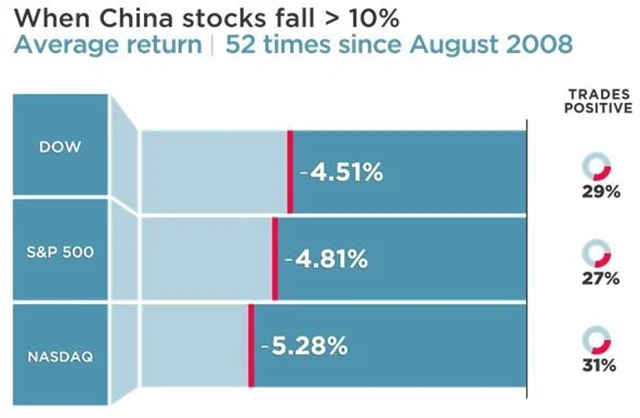 Podle analytické společnosti Kensho však klesnou americké akcie v 70 % případů, kdy akcie v Šanghaji ztratí alespoň 10 %. Ztráta na amerických trzích se v takovém případě pohybuje v průměru kolem 5 %. Společnost vychází z dat za posledních deset let, u jednotlivých hlavních indexů v USA přitom jsou mírné rozdíly.