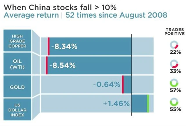 A čínskými akciemi zpravidla klesají také ceny základních komodit, jako jsou měď, která ztrácí v 78 % případů přes 8 %, a ropa, která v 67 % případů ztrácí kolem 8,5 %. Zlato jako bezpečný přístav ztrácí téměř v polovině případů, ale jeho průměrná ztráta je do procenta. Pokles cen čínských akcií je dobrou zprávou pouze pro ty, kteří drží dolary, protože americká měna v takovém případě (v polovině případů) posiluje o téměř 1,5 %.