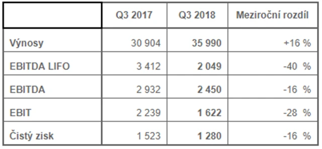 Provozní zisk před úroky, daněmi, odpisy a amortizací (EBITDA LIFO) se snížil o 40 % na 2,05 miliardy korun. Analytici odhadovali, že čísla budou meziročně lepší. Objem zpracované ropy dosáhl v období od července do září dvou milionů tun a míra využití výrobních kapacit v rafinérské části Unipetrolu byla 92 %.