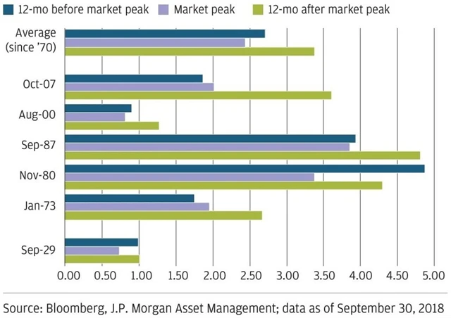 Odpověď nabízí následující graf, který porovnává výkonnost akciového portfolia (plně zainvestovaného v indexu S&P 500) v horizontu 10 let ve třech scénářích. V prvním scénáři portfolio vzniklo 12 měsíců před dosažením vrcholu na akciovém trhu, v druhém při dosažení vrcholu a ve třetím 12 měsíců po jeho dosažení.