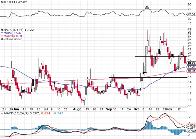 Index volatility VIX je po krátké exkurzi nad 20 zpět v pásmu 15–20. Pro akcie sice nevysílá býčí signál, ale při negativních očekáváních, jaká převládají, je stále pouze na dlouhodobém průměru.