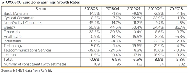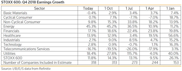 Jak se vyvíjejí odhady růstu či poklesu zisků evropských firem za 4Q2018?