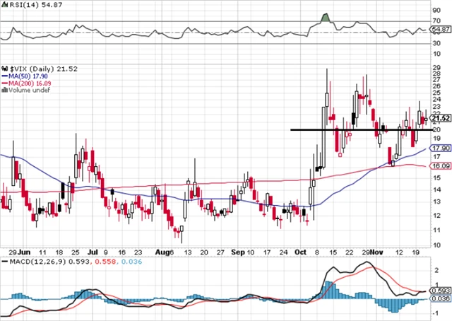 Index volatility VIX je i přes hlubší ztrátu indexu S&P 500 pouze lehce nad 20. Při poklesech v uplynulém týdnu se nevyvíjel nijak extrémně, výprodeje nebyly spojené s panikou.