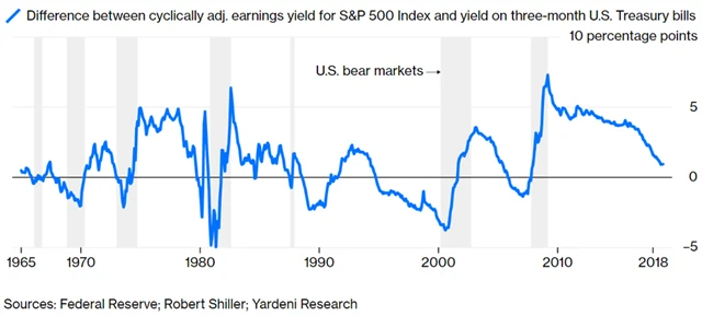 Nir Kaissar, zakladatel poradenské společnosti Unison Advisors, ale v článku pro Bloomberg píše, že je současná inverze výnosové křivky malá. Investoři by se podle něj měli obávat úplně jiné inverze. Záporný rozdíl mezi ziskovým výnosem z akcií (takzvaný earnings yield se počítá jako obrácená hodnota tržního ukazatele P/E; ukazuje, jaký výnos by investor obdržel, kdyby byl celý zisk firmy vyplácen jako dividenda) a výnosem tříměsíčních státních pokladničních poukázek (ekvivalent pro hotovost) je podle Kaissara velice dobrým indikátorem blížícího se medvědího trendu na akciovém trhu.