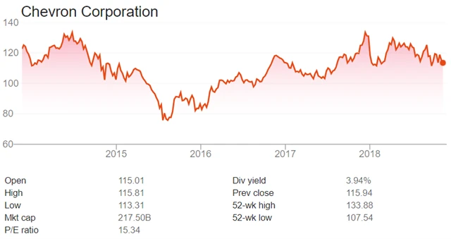 Ropný průmysl není v současnosti žádným extra tahákem. Firma Chevron je ale analytiky považována za jednu z nejlepších investic v oboru. Přestože se sektoru nedaří, Chevron ztrácí za letošek "pouze" něco přes 7 % a od únorových propadů je v plusu kolem 5 %. "Chevron pokračuje v naplňování svých zlepšených výhledů, což se může promítnout do lepší než očekávané kapitálové efektivnosti v roce 2019 a vytváří to stabilní toky volné hotovosti," míní William Featherston z Credit Suisse.