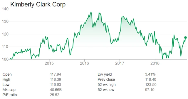 Výrobce hygienických pomůcek není zrovna titulem pro růstové investory, ale hodnotové hráče může těšit, že po produktech osobní spotřeby bude poptávka téměř bez ohledu na ekonomický cyklus. Firmě se daří zvyšovat zisk (poslední kvartál +7 % meziročně) i při klesajících tržbách (4,6 miliardy USD, pokles o 2 % meziročně) a pokračovat v restrukturalizaci, která by do roku 2021 měla ušetřit až 500 milionů USD ročně.