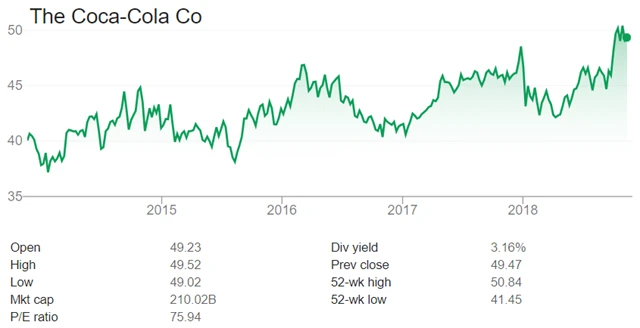 Favorit Warren Buffetta je od začátku roku v plusu téměř 8 %, což je v porovnání s trhem nadprůměr. Pokud si akcie tempo udrží, bude to podruhé v posledních pěti letech, co se jim podaří porazit index Dow. Firma v posledních letech bojuje s odlivem zákazníků, a také proto se rozhodla za 5,1 miliardy USD koupit britskou společnost Costa Coffee disponující 4 000 pobočkami po celém světě. "Teplé nápoje jsou jedním z mála zbývajících segmentů, kde Coca-Cola nemá globální značku," uvedl generální ředitel společnosti James Quincey.
