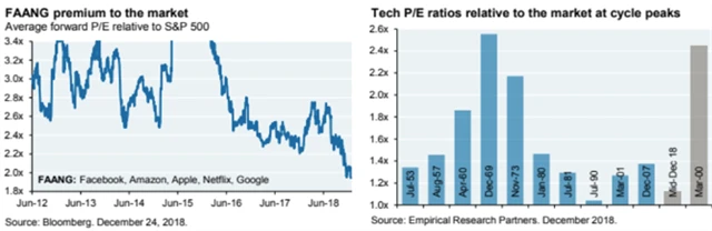 Veřejně obchodované společnosti označované jako technologické se nyní obchodují s jedněmi z nejnižších prémií vůči trhu v historii. Ukazatel P/E akcií Facebooku, Applu, Amazonu, Netflixu a Alphabetu jen za poslední dva roky spadl o více než 60 %.