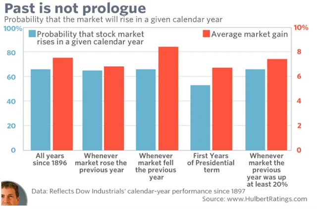 V první řadě je potřeba zopakovat, že výkonnost jednotlivých aktiv, akcie nevyjímaje, v jednom roce nemá statisticky žádný dopad na to, jak se danému aktivu daří v následujícím kalendářním roce.