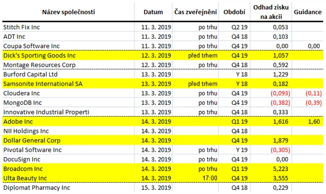 Níže najdete odhady výsledků jednotlivých společností, které oznamují hospodářská čísla v následujícím týdnu.