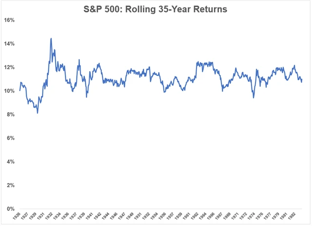 Zatím nejhorším okamžikem pro vstup na americký akciový trh bylo při 35letém investičním horizontu září 1929. Průměrný roční výnos dosáhl v horizontu tří a půl dekády zhruba 8,1 %.