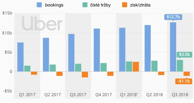 Ani Uber však nedosahuje zisku. Za rok 2018 reportovala společnost ztrátu 1,8 miliardy USD při tržbách 11,3 miliardy USD. Tržby se přitom meziročně zvýšily o 43 % a ztráta poklesla o 400 milionů USD.