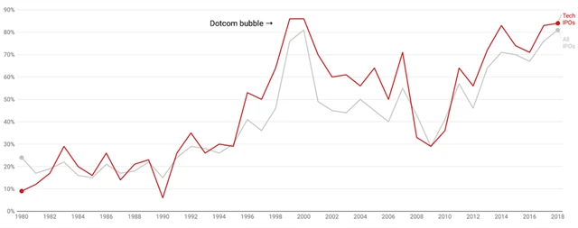 Ztrátovost společností mířících na trh se stává běžným úkazem. V roce 2018 bylo přes 80 % firem vstupujících na americké akciové trhy ve ztrátě rok před samotným IPO. U technologických podniků podíl dosáhl téměř 85 %. To jsou hodnoty, které lze srovnávat snad jen s rokem 2000, kdy praskla internetová bublina, které předcházelo období masivního počtu IPO technologických společností.