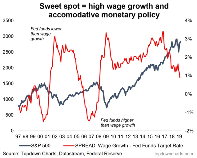 Ukazatel Fed Sweet Spot, který patří mezi oblíbené indikátory Calluma Thomase z Topdown Charts, naznačuje, že současné podmínky na trhu pro index S&P 500 nejsou zrovna nejpříznivější. Indikátor sleduje rozdíl mezi růstem mezd (podle dat atlantského Fedu) a úrokovou sazbou Fedu. Čím je indikátor výše (sazby jsou nižší než růst mezd), tím lépe to vypadá s akciovými trhy. A naopak.