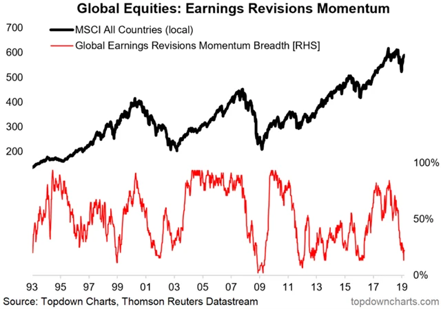 Druhým ukazatelem, na který Thomas upozorňuje, je křivka znázorňující zdraví firem z pohledu odhadů vývoje jejich zisků. Jak ovšem Thomas zdůrazňuje, graf vychází z odhadů analytiků, kteří se mohou i pod tlakem okolí mýlit. I proto podle něj lze tento ukazatel do jisté míry vnímat také jako kontrariánský indikátor.