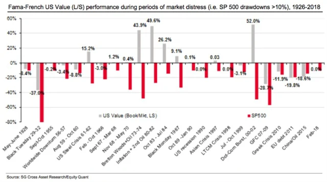 Na grafu je vedle výkonnosti indexu S&P 500 také výkon skupiny hodnotových akcií vybraných podle Fama French oceňovacího modelu. Tento výkon nebyl vždy lepší než výkon celého trhu, v průměru ale tato skupina během 25 sledovaných velkých poklesů odepsala 2,4 %, zatímco S&P 500 celých 25 %.