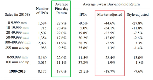 Ben Carlson z Ritholtz Wealth Management vysvětluje, že jedním z důvodů obrovského zájmu investorů o IPO jsou příběhy z minulosti. Kdo někdy neslyšel, jak investoři zbohatli díky tomu, že si během IPO koupili balík akcií Applu, Microsoftu nebo Amazonu? Jak ale ukazuje následující tabulka, minimálně v posledních zhruba třech a půl dekádách nové akcie prudce posilují hlavně během prvního dne na burze, zatímco v horizontu několika let jejich výkonnost zaostává za trhem.