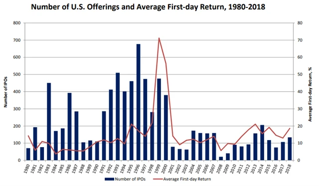 Od roku 1980 zaznamenalo více než 36 % společností během prvního dne na burze růst ceny akcií o 10-60 %, bezmála 7 % firem zaznamenalo dokonce skokový růst ceny o více než 60 %. Žně zažívali investoři hlavně na konci minulého století, kdy vrcholila internetová horečka.