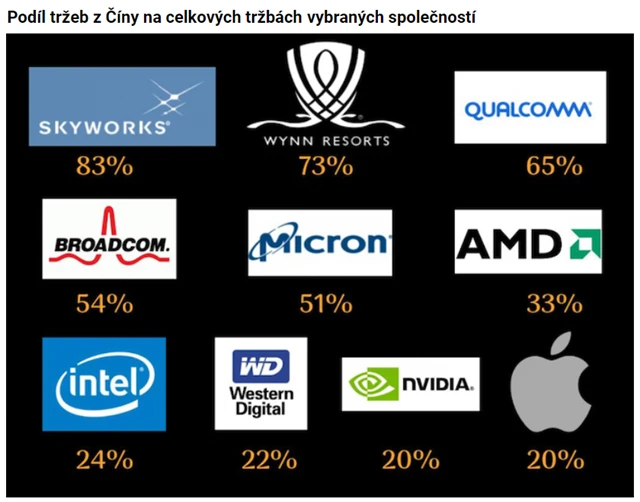 "Nejvíce zasaženy by měly být společnosti Skyworks Solutions, Wynn Resorts, Qualcomm, Broadcom a Micron. Výrazně by to pocítila také společnost Apple, pro kterou je čínský trh druhý nejdůležitější po Severní Americe," napsali analytici.