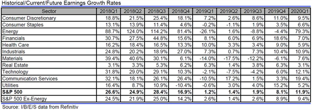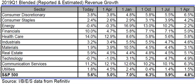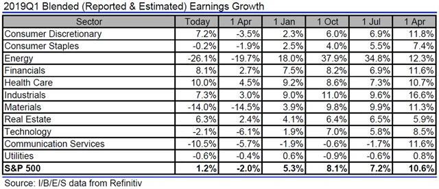 Jak se vyvíjejí odhady růstu či poklesu zisků a tržeb amerických firem za 1Q2019?