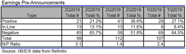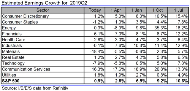 Jak se vyvíjejí odhady růstu či poklesu zisků amerických firem za 2Q2019?