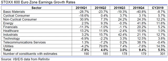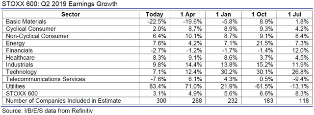 Jak se vyvíjejí odhady růstu či poklesu zisků evropských firem za 2Q2019?