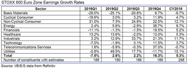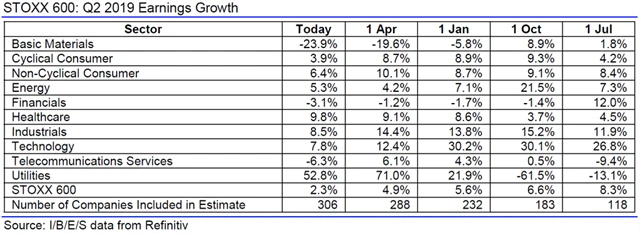 Jak se vyvíjejí odhady růstu či poklesu zisků evropských firem za 2Q2019?