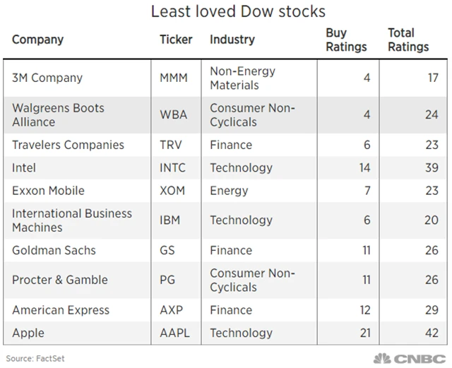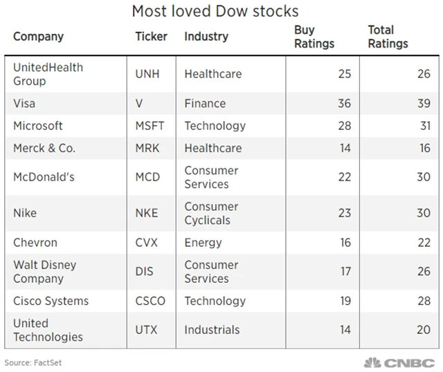 CNBC seřadila společnosti z indexu Dow Jones Industrial Average podle toho, jaký podíl nákupních doporučení mají jednotlivé firmy z celkového počtu hodnocení daného titulu. Využila přitom data od společnosti FactSet.