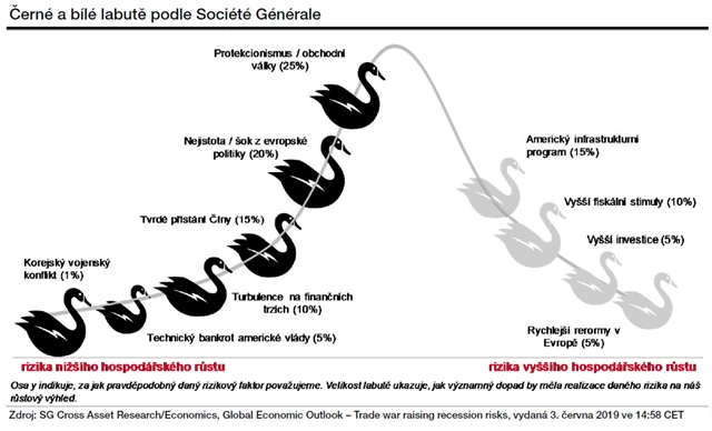 Naděje, že dva hlavní důvody nejistoty, které zhoršují výhled pro globální ekonomiku, tedy obchodní rozepře mezi USA a Čínou a brexit, budou rychle vyřešeny, se prozatím nevyplňují (stav před zasedáním G20 v Ósace - pozn. red.). Vyjednávání mezi americkými a čínskými představiteli se zadrhla, což vedlo k další eskalaci problémů v podobě nově zaváděných cel. Situace se zhoršila i v souvislosti s firmou Huawei a dalšími technologickými společnostmi a její řešení se jeví jako stále obtížnější.