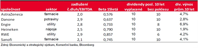 Abychom ověřili, že konkrétní tituly splňují podmínku defenzivnosti, sledovali jsme hodnotu bety (maximální hodnotu 15leté bety jsme nastavili na 0,9). Abychom vybírali finančně stabilní společnosti, zaměřili jsme se na firmy s poměrem čistého dluhu a EBITDA do 3.