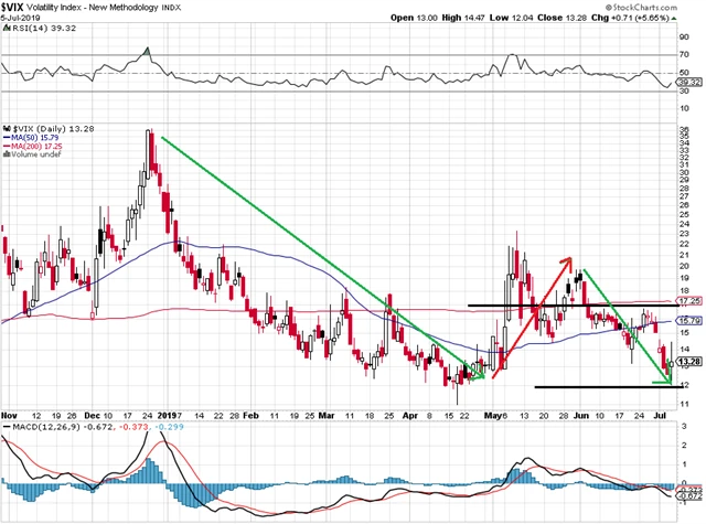 Index volatility VIX se v pátek přiblížil úrovni 12 bodů, na které byl naposledy v dubnu. Jeho nízká hodnota je pro akcie býčím signálem, změnu by znamenal až jeho růst nad 17.