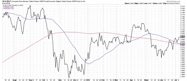 Poměr indexů těchto dvou sektorů (XLY vs. XLP) se na lokální minima dostal loni v listopadu a slabší výkonnost akcií ze sektoru necyklického spotřebního zboží naznačovala spíše opatrnost investorů. Růst poměru v posledním měsíci ale indikuje optimističtější výhled.