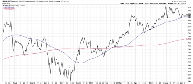 Poměr indexu růstových akcií a indexu hodnotových akcií (RPG vs. RPV) má růstovou tendenci již od loňského listopadu. Platí přitom, že dokud je poměr nad 50denním klouzavým průměrem (modrá křivka), preferují investoři růstové tituly.