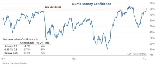 V minulých týdnech důvěra dumb money překročila 80 % a dostala se mezi 2,3 % nejvyšších výsledků průzkumu v historii a na jednu z nejvyšších hodnot za uplynulých 20 let. V minulosti tak vysoká důvěra investorského retailu v akcie předznamenávala jejich chabou výkonnost v následujícím období (konkrétní čísla jsou v grafu), zejména v době, když se trh nevzpamatovával z hlubokých propadů.