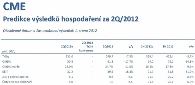 Druhé čtvrtletí bývá tradičně pro mediální společnost CME silnější než to první. Nicméně prohlubující se evropská dluhová krize, která působí na zadavatele reklamy, je důvodem našeho sníženého optimismu, což se netýká pouze druhého kvartálu, ale i zbytku roku. Stejně tak posilující americký dolar má a bude mít negativní vliv na tržby, když v našem modelu predikujeme další oslabení středoevropských měn vůči USD po zbytek roku.