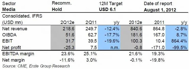 Ve 2Q2012 očekáváme tržby 231 milionů USD, což je o 38 % více než v minulém čtvrtletí. Na meziroční bázi předpokládáme pokles tržeb o 7,5 %, když hlavním důvodem je meziroční oslabení měnových kurzů středoevropských měn vůči americkému dolaru. Co se týče tržeb v národních měnách, predikujeme pokles na meziroční bázi na trzích v České republice a v Rumunsku (-2 %), na ostatních trzích dojde podle našeho názoru k mírnému meziročnímu růstu. Co se dynamiky růstu týče, největší růst tržeb čekáme v segmentu New Media s meziročním růstem o 27,2 % (mezičtvrtletně o 25,2 %).