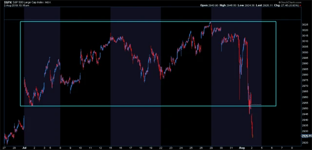 Na hodinovém grafu indexu S&P 500 vidíme, jak kupci na trzích v průběhu července vytlačili kurz výše v očekávání snižování sazeb na nová historická maxima. První dva srpnové dny je ale vrátily na zem.