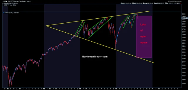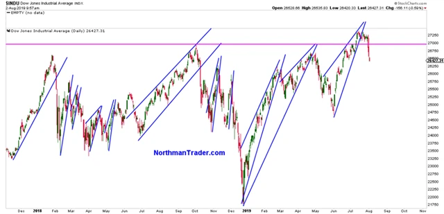Podobné vzestupné klíny jsou také na grafu indexu Dow.