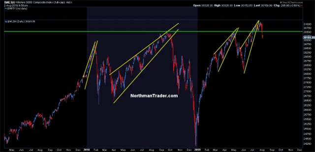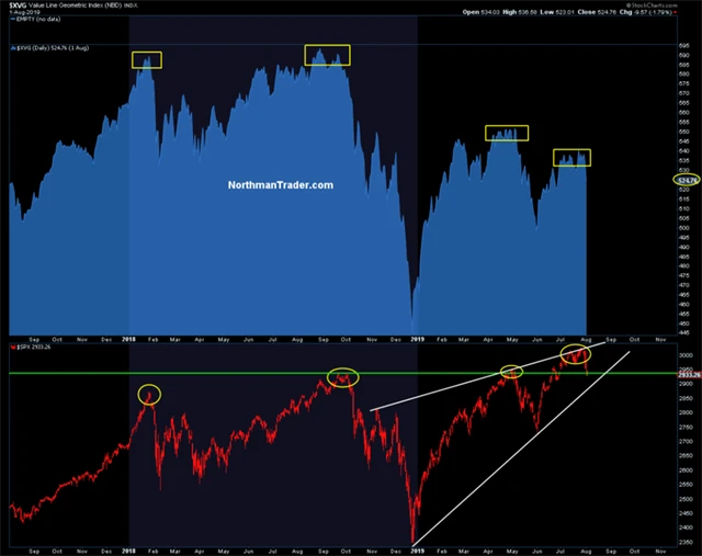 Zajímavý (ne v pozitivním směru) je i pohled na vývoj Value Line Geometric Indexu (ten ukazuje výkonnost trhu, sleduje medián pohybu akcií a reprezentuje portfolio typického drobného investora; velcí investoři jej sledují jako ukazatel výkonnosti akcií firem se střední kapitalizací). Při každém novém maximu indexu S&P 500 vytvářel Value Line Geometric Index nižší maxima, což ukazuje na stále slabší růst.