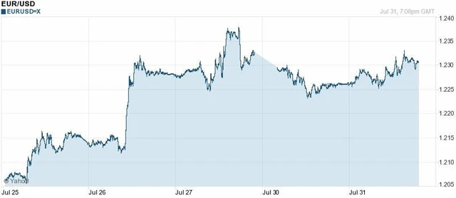 Společná evropská měna se i v závěru července snaží udržet nad hladinou 1,23 EURUSD. Během úterý s tím nijak nezamávala ani sada evropských makrodat (nezaměstnanost v Německu stagnuje na 6,8 %, v EMU v červnu 11,2 %), ani výrazně lepší spotřebitelská důvěra v USA (v červenci 65,9 bodu při očekávaném zhoršení na 61,5 z 62,7 bodu). Hlavní slovo si ovšem již ve středu vezme Fed a ve čtvrtek ECB. Jakékoli jiné než "vyčkávací" výroky a oznámená opatření budou hýbat nejen s kurzem eura, ale i s akciovými indexy. Analytici jsou ovšem ohledně srpnových zasedání spíše skeptičtí.