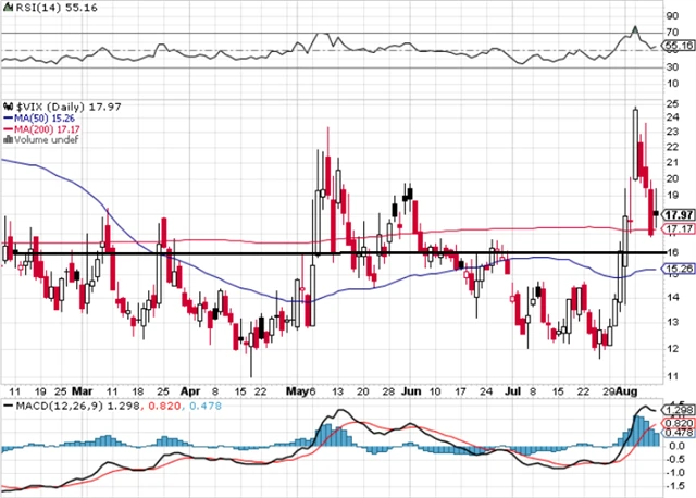 Index volatility VIX v pondělí rychle vystřelil k 25, týden ale uzavřel bez výrazně týdenní změny lehce nad 17. Po zklidnění by mohlo jít o návrat k dlouhodobému průměru.