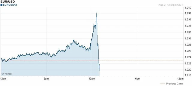 Sečteno a podtrženo, Draghi neoznámil žádný okamžitý a jasný scénář zásahu ECB. Na analýzy je ještě brzo, trhy ovšem daly své zklamání najevo hned - euro krátce kleslo pod 1,22 po rychlém skoku až na 1,24 USD, španělské a italské dluhopisy začaly ztrácet, stejně tak akcie a americké futures.
