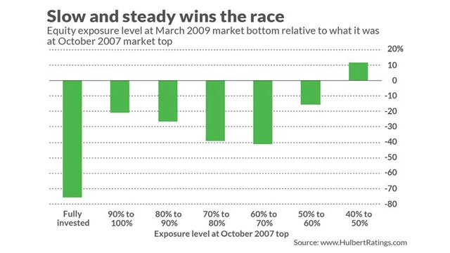 Mark Hulbert, zakladatel společnosti Hulbert Financial Digest, se pokusil zanalyzovat několik stovek investičních strategií popisovaných v médiích v období medvědího trendu mezi říjnem 2007 a březnem 2009. V tabulce níže je zobrazena expozice vůči akciím z března 2009 oproti tomu, kolik měla strategie zainvestováno v akciích v říjnu 2007.