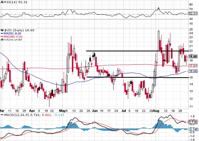 Index volatility VIX osciluje okolo 20, aktuálně spíše v pásmu 15-20. Pro akcie to v současnosti neznamená jasný signál.